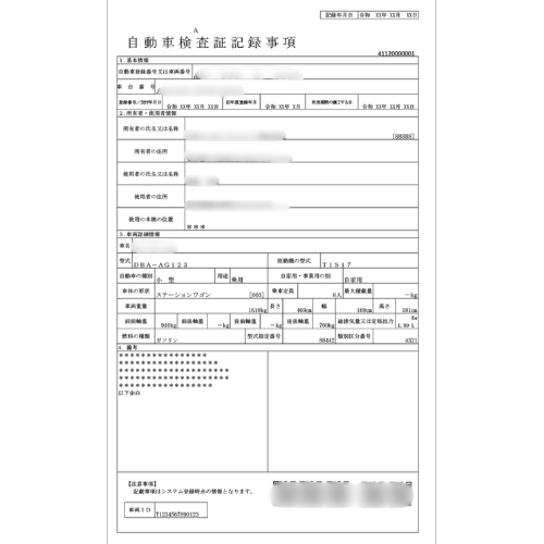 自動車検査証記録事項(登録番号、所有者・使用者情報は個人情報のため隠してください)